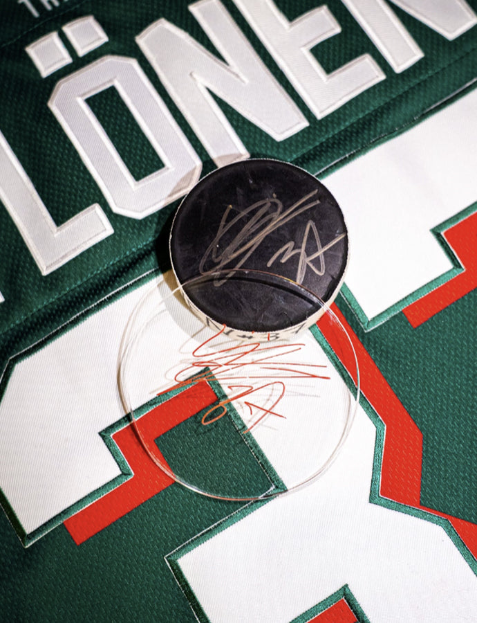 Offrez vous le palet et le plexignature du MVP, Sebastian Ylönen, lors du match contre les Gothiques d'Amiens (victoire 5-2).
